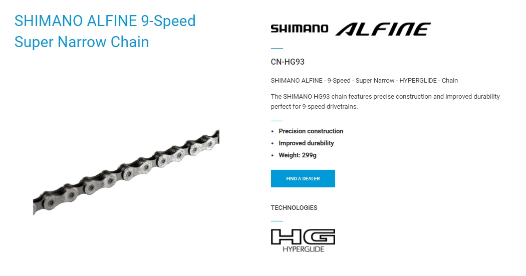 CN-HG93 SHIMANO ALFINE - 9-Speed - Super Narrow - HYPERGLIDE - Chain The SHIMANO HG93 chain features precise construction and improved durability perfect for 9-speed drivetrains. Precision construction Improved durability Weight: 299g