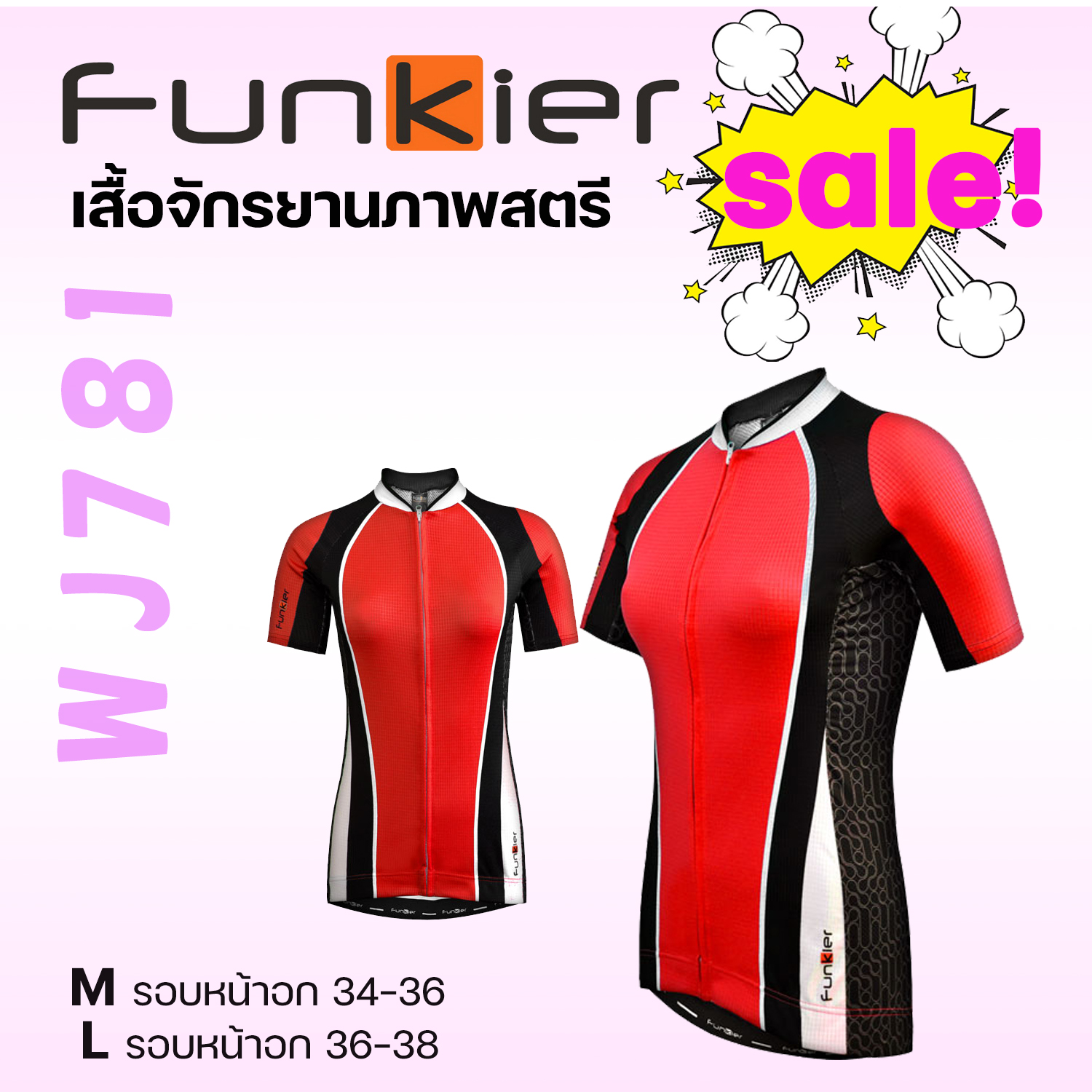 เสื้อปั่นสุภาพสตรี FUNKIER เสื้อผ้ากัน UV98% SPF 50+ ระบายความร้อนดีเยี่ยม ทรงสวย ออกแบบมาสำหรับสุภาพสตรีโดยเฉพาะ size วัดรอบอก เป็นนิ้วค่ะ XS = 31.5 S = 33 M = 34.5 L = 36 XL = 38 _________________ www.bovelobangkok.com Tel. 087-7015151 / 083-2978800 LINE: bovelobangkok ร้านอยู่บนถนนวิภาวดีรังสิต กม.4 (ก่อนถึงไฟแดงสุทธิสาร ฝั่งขาออก) เปิด 10.00 - 20.00 (หยุดวันจันทร์) ยินดีต้อนรับค่ะ