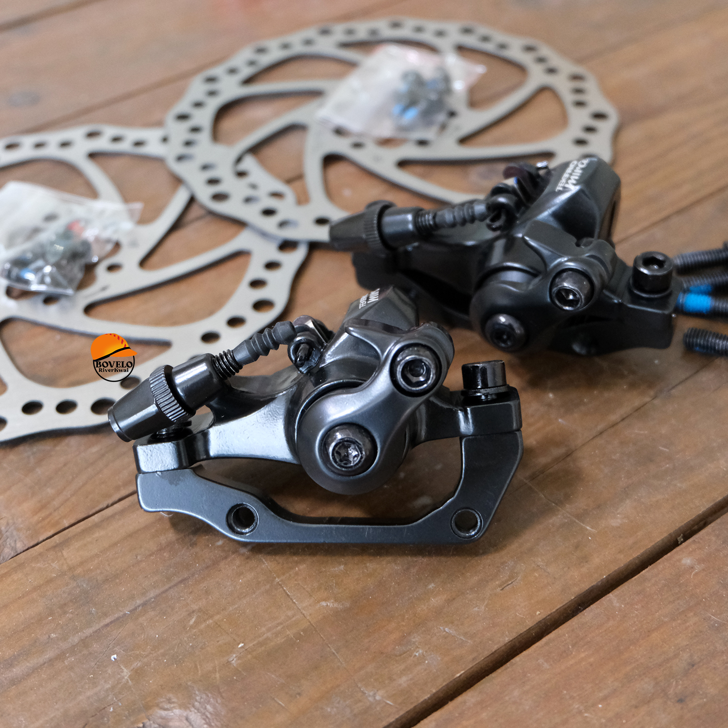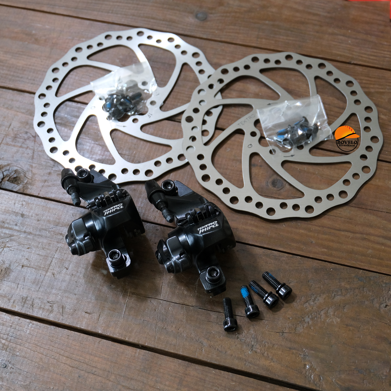 รายละเอียดสินค้า Tektro mechanical disc brake ชุดดิสก์เบรกแบบสาย พร้อมใบดิสแบบ 6รู รุ่น Mira MD400 ราคาต่อคู่หน้า/หลัง ประเภท ROAD ความของของใบดิส 1.8 มิลลิเมตร ในชุดประกอบด้วย ปั๊มเบรก 2 ชิ้น (หน้า + หลัง) ใบดิสก์ รู จำนวน 2 ใบ น๊อตยึดใบดิสก์ 6 ตัว x 2 ชุด น้ำหนัก 162 กรัม ต่อข้าง มีเฉพาะสีดำ สินค้าแพ๊คถุง