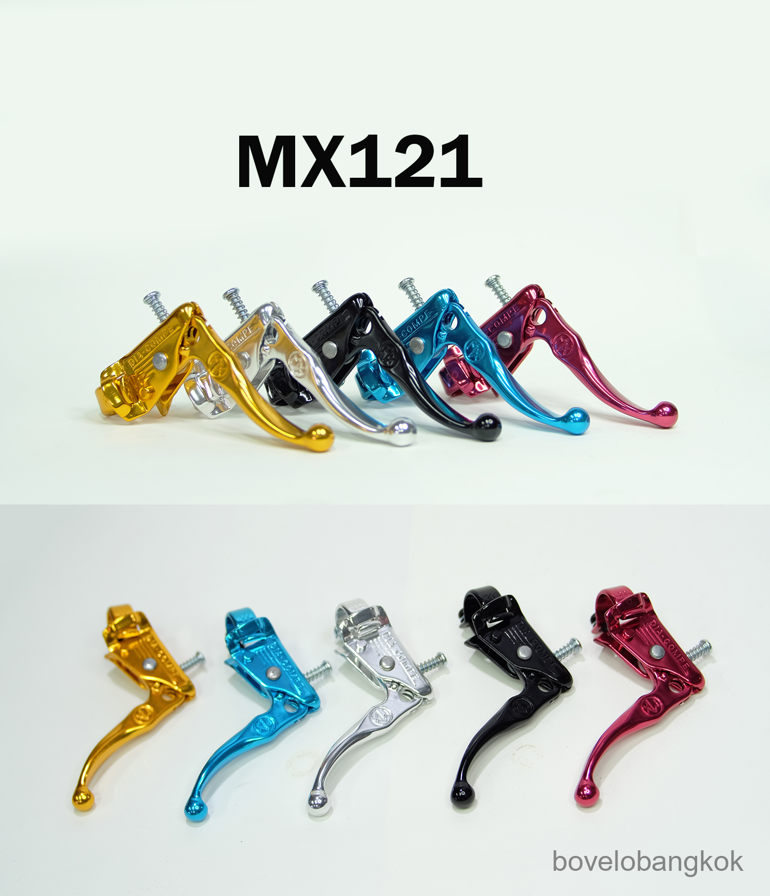 MX-121 BRAKE LEVER มือเบรกแฮนด์ตรง ประเภท ฟรีสไตล์ แคลมป์ 22.2 Forged Aluminum 100g/pair แหล่งผลิต ประเทศไต้หวัน มีสีดำ สีเงิน สีฟ้า สีทอง และสีแดง