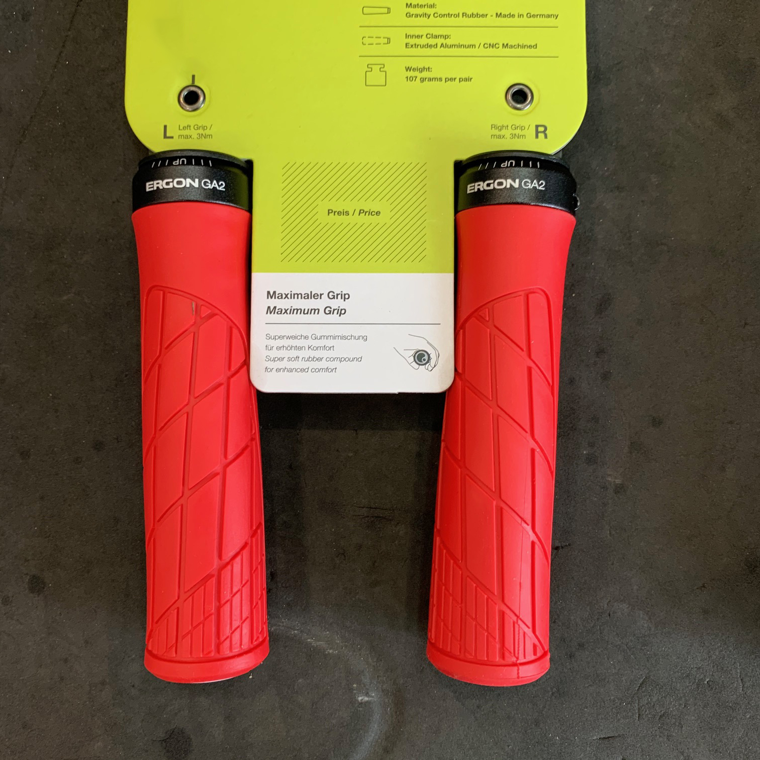 ERGON รุ่น GA2 GRIPS made in Germany Superb tactile feel. Super soft GravityControl rubber compound developed and manufactured in Germany. UV stable rubber compound. Optimized form allows reduced force to be used when gripping. Grip zones are matched to the hand. Inboard aluminum clamp. Carbon bar compatible. 30mm diameter 136mm length 107g per pair.