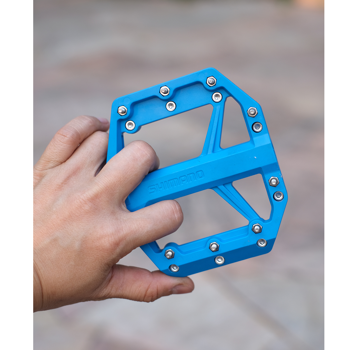 บันไดแป้นใหญ่ SHIMANO PD-GR400 เป็นบันไดที่พัฒนาต่อมาจากรุ่น GR500 ที่เป็นวัสดุอลูมิเนียม และรุ่นนี้ทำให้ลดน้ำหนักได้มากกว่าถึง 139 กรัม! เป็นบันไดสไตล์ Flat Pedal แป้นใหญ่ เหยียบได้ทั้งสองด้าน มีหมุดกันรองเท้าลื่น ทำให้มั่นใจทุกการปั่น วัสดุ Resin composite body และน้ำหนักเบาเพียง 394 กรัม ขนาดแท่นบันได: 101 x 96mm ความหนา: 16mm หมุดกันลื่น สามารถถอดออกได้ / 9 ตัว สไตล์ trail / MTB / city / touring
