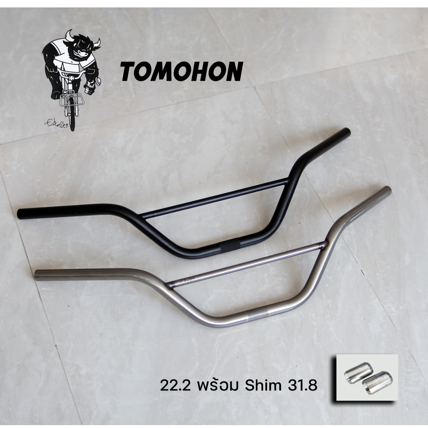 ED*SEN TOMOHON แฮนด์ทรง klunger จัดทรงภูเขามาเป็นสไตล์พ่อบ้าน วัสดุ Steel JIS G3445 (Japan Industrial Standard) กว้างกางแขนเต็มไหล่ 750มม ยก 4 นิ้ว (C-C) bar bore 22.2 with Shim 31.8 (ใช้กับสเต็ม 22.2 และมีแผ่นเสริม 31.8) เลือกใช้ได้ทั้งสเต็มโอเวอร์ไซส์หรือสเต็ม bmx สีเปลือยแบบเคลือบเงา (Raw) และสีดำกึ่งเงา