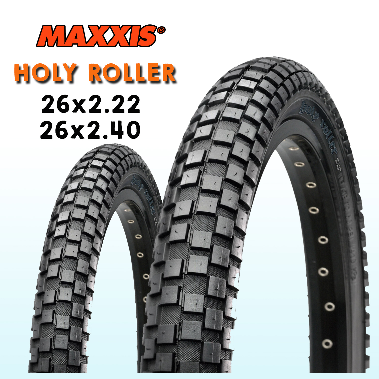 MAXXIS HOLY ROLLER size 26x2.20 size 26x2.40 DIRT | FLAT | PARK | STREET The Maxxis HolyRoller uses an inverted knob design making it a versatile performer from dirt to pavement SINGLE COMPOUND 60 TPI Casing Recommend for: HARD PACK / PAVEMENTS/ ASPHALT, SKATE PARK Installation Front & Rear