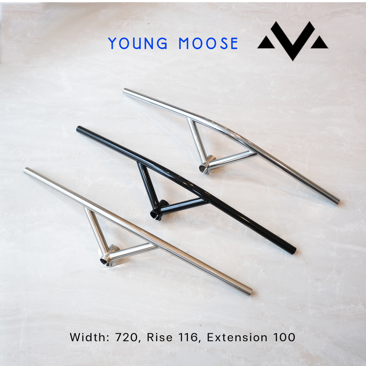 YOUNG MOOSE กว้าง 720 รัดซาง 28.6 ยก วัดปลาย 116 แคลมป์หนีบซาง สูง 5.5 ซม ยื่น 100 เยื้องกลับปลายแฮนด์พอดีซาง น้ำหนัก 820 กรัม +/- BLACK CHROME NICKEL
